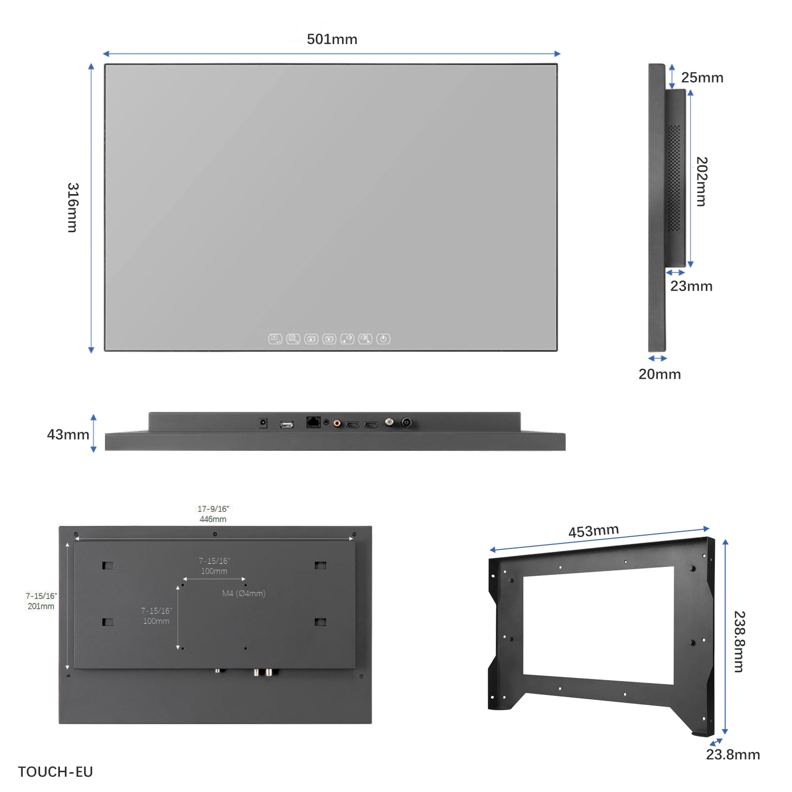 – Recessed Cutout: 453W x 238.8H x 22.5D mm (17.8"W x 9.4"H x 0.88"D)