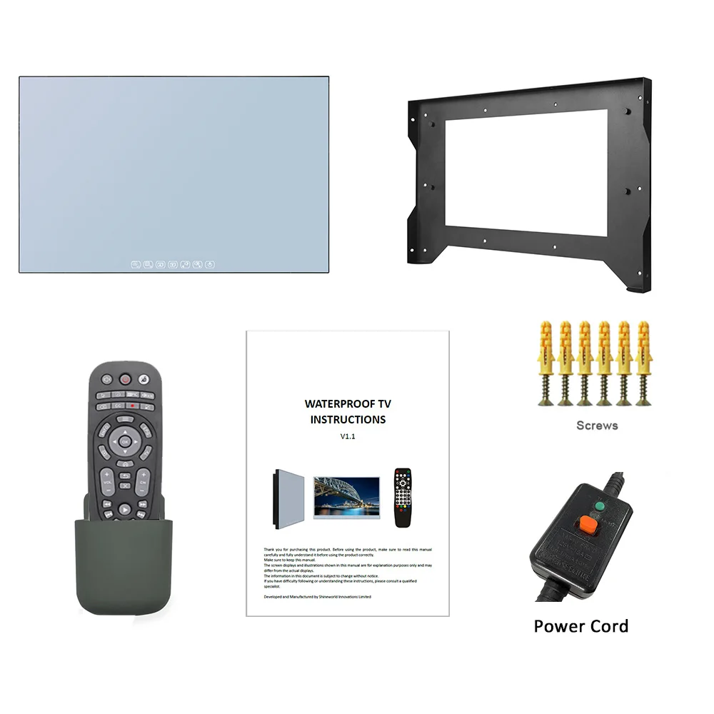 A: All of our Bathroom TVs come complete with relevant bracket and instructions (for installation), and accessories to power and control (power adapter and remote control).